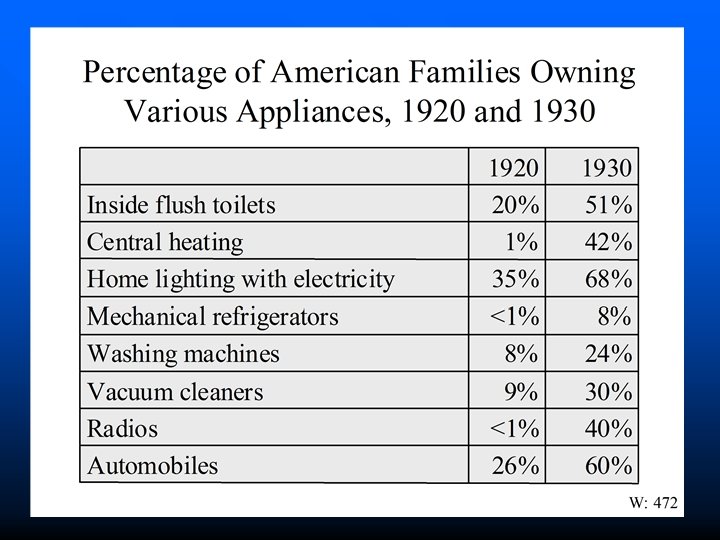 n n n an agri. depression in early 1920's contributed to this urban migration U. S. farmers lost agri. markets in postwar Europe at same time agri. efficiency increased so more food produced (more food = lower prices) and fewer labourers needed so farming was no longer as prosperous, and bankers called in their loans (farms repossessed) so American farmers enter the Depression in advance of the rest of society