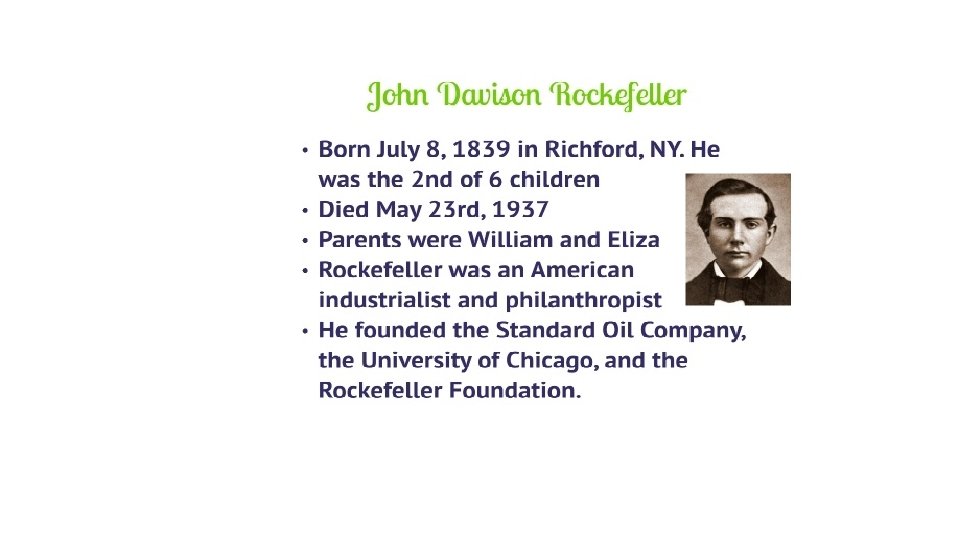 The Rockefellers trace their wealth back to John D. Rockefeller (pictured right), who founded Standard Oil in 1870. The company grew to control most of the oil refining in the U. S. , making John D. the nation's richest man and the country's first billionaire; adjusted to today’s 4 dollars he would have been worth in excess of $30 billion. He and son John Jr. later dedicated themselves to philanthropy, giving away more than $1 billion, including establishing the University of Chicago and Rockefeller University. John Jr. built Rockefeller Center in midtown Manhattan. Today, the fortune is spread out among 174 heirs. John D's only surviving grandson, David, who had a long career with Chase National Bank, is the world's oldest billionaire at age 101. In March 2016, the Rockefeller Family Fund, a family philanthropic entity, announced that it would divest all its fossil fuel investments, specifically calling out Exxon Mobil, a descendant of Standard Oil, for misleading the public about the risks of climate change.