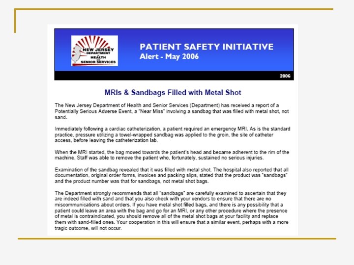 February 5, 2001 Item: Magnetic Resonance Imaging (MRI) systems, all. Specific Incident: A “sand bag” attached to a patient’s arm undergoing an MRI exam contained iron pellets (unknown to staff) encased in heavy vinyl; brand name “North West”. When the patient was being moved into the MRI bore, the iron-filled bag flew into the magnet and pinned the patient’s forearm to the side of the magnet. Emergency measures were used to turn the magnet off, and the patient was unharmed. Sometimes, “sand bags” = “iron bags”