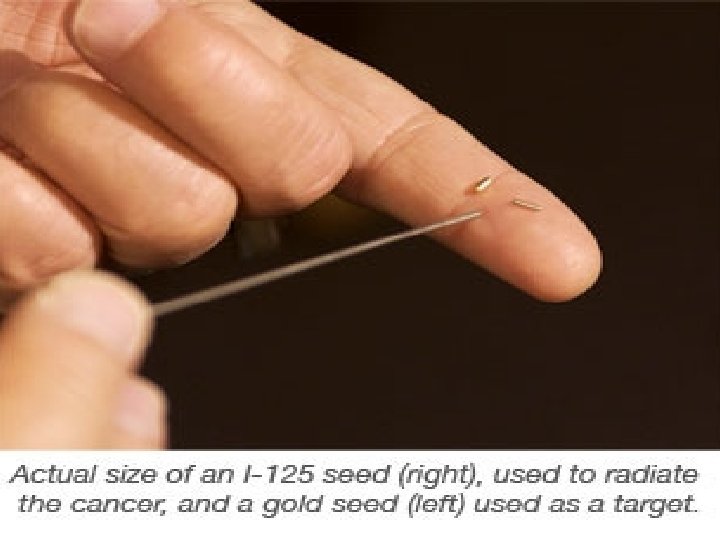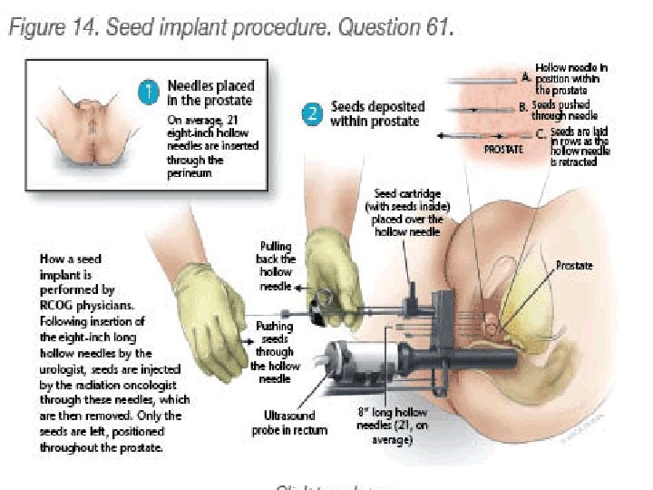 Brachytherapy • Radiation source is placed inside or next to the area requiring treatment • Needles are placed through skin of the perineum • Radioactive seeds are implanted through needles • Permanent seeds – Iodine, Palladium, Cesium • Temporary seeds – Iridium