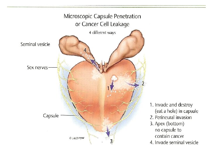 Natural history • If detected early, prostate cancer remains confined to the prostate or immediately adjacent tissues – Spread to surrounding nerves / fatty tissues – Spread to adjacent lymph nodes – Spread to distant sites such as bone