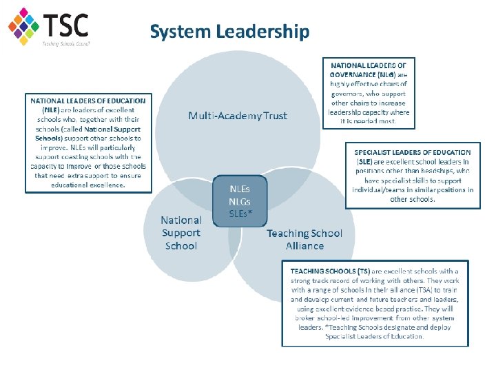 TSC – CURRENT NATIONAL PICTURE Teaching Schools The Current Picture § 736 Teaching Schools § 9 TSC regions, increasingly made up of a number of sub-regional groups – leading on: ITT; CPD; S 2 SS § Diverse and representative membership: nursery; primary; secondary; special; academies; independent; sixth form colleges § 7, 500 Specialist Leaders of Education § 1, 200 National Leaders of Education § 510 National Leaders of Governance