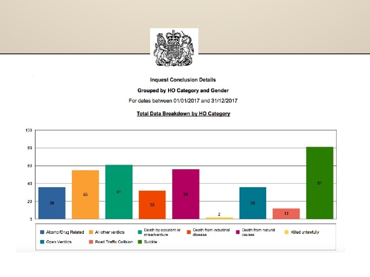 • A local service – not centrally funded • Coroner’s are independent judges, but the service is not funded by the Mo. J • In East London service is funded by 5 LA Boroughs (one Lead Borough) • In East London, Coroner’s officers (MPS) and administration staff (LA) • 1 full time Coroner, plus Assistant Coroners • 1 Court building • 2017 – 2, 300 deaths reported; 42 investigations opened; 371 Inquests concluded
