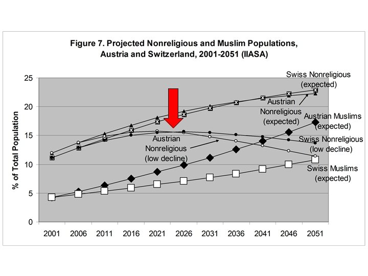 Austria: Projected Proportion Declaring ‘No Religion’ Assuming: High secularization trend Constant secularization trend Low secularization trend Roman Catholics Protestants Muslims Others Without Total Austria, TFR 2001 1. 32 1. 21 2. 34 1. 44 0. 86 1. 33