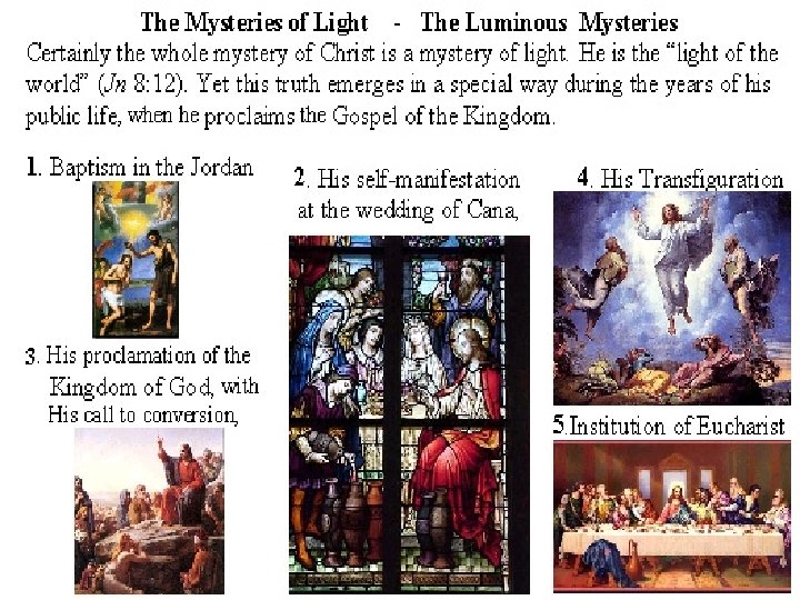 � The Hail Mary owes its origin to the rosary. When people said the rosary in the twelfth century, Gabrielle’s greeting “Hail Mary, full or grace, the Lord is with thee” was often said along with the Our Father. Later, Elizabeth’s greeting ”blessed are you among women” was added. It was not until the sixteenth century that the words “Holy Mary. , Mother of God, pray for us sinners now and at the hour of our death” were added. Various people have added other things to the rosary over the centuries. In the fifteenth century, the rosary was divided into fifteen brackets (or decades) and a Dominican monk assigned mysteries to each of the decades. These mysteries were events in the life of Jesus as written in the gospels. By meditating on these events even the illiterate could know the stories in the Bible. These decades were the same as ours except for the last two Glorious mysteries. In those two, the Coronation and the Assumption together made up the fourteenth decade and the fifteenth decade was the Last Judgment. On October 16, 2002, Pope John Paul II, declared that the following year would be the “Year of the Rosary”. For the first time in centuries a change was made in the rosary. The Pope added and defined 5 new mysteries that concerned events in the public life of Jesus. These new mysteries were called the “Luminous Mysteries” or “Mysteries of Light” Today’s complete rosary is now made up of twenty decades of the Hail Mary, separated by an Our Father and a Glory Be and sometimes the Fatima prayer. Evidence again that the rosary is a living prayer that grows with the church. We usually break the rosary into four sets. The four sets are The Joyful Mysteries, The Sorrowful Mysteries, The Glorious Mysteries, and the Luminous Mysteries. One set is prayed on a rosary that has five decades. Each set is prayed on designated days of the week. Despite all the additions and changes, the important core of the rosary has always remained the same. It is a way for God’s people to make holy the day, and to remember the life of Jesus and his mother. May these humble origins always be with us each time we pray the rosary.