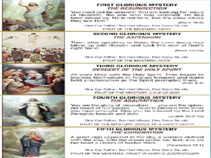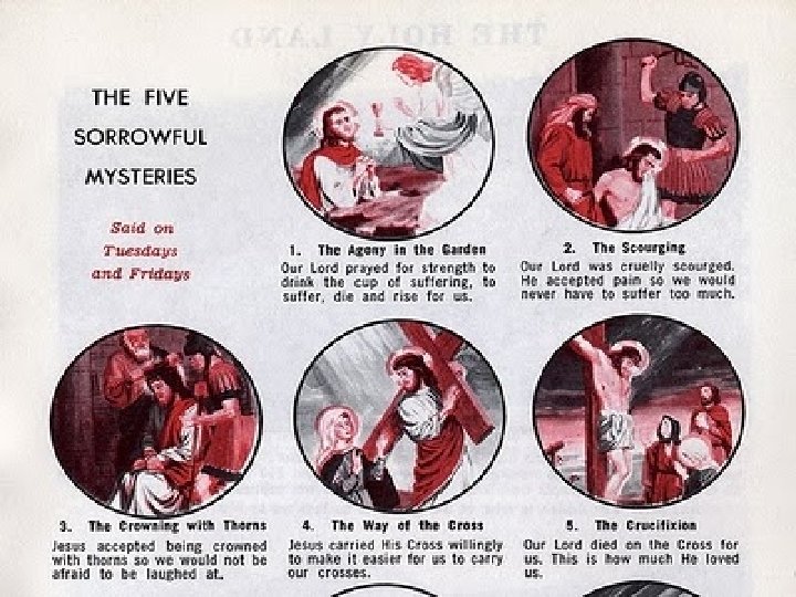How do we pray the rosary �Each day people pray 5 decades of the rosary and each decade represents an event in the life of Jesus and his mother. The five decades prayed each day make up a mystery. There are four sets of mysteries on the rosary � On Monday and Saturday, meditate on the “Joyful Mysteries” � On Thursday, meditate on the “Luminous Mysteries” � On Tuesday and Friday, meditate on the “Sorrowful Mysteries” � On Wednesday and Sunday, meditate on the “Glorious Mysteries”