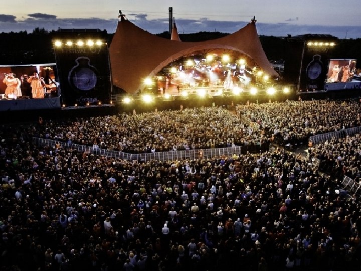 Stages The bands presented at Roskilde Festival are traditionally a balanced mix of large, well-known artists and up-andcoming names. As opposed to most other European festivals all bands play "real" concerts lasting for at least an hour. The stages were until 2003 named after their colour The music covers such styles as rock, Hip Hop, Metal, urban, electronica and 3 rd world contemporary music The Orange Stage is open in front of a huge field are: The current tents