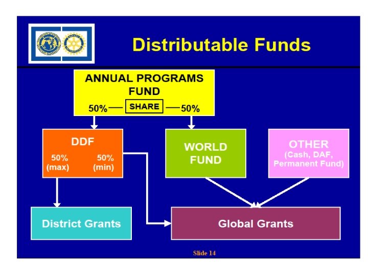 Future Vision Funding Attributes District Grants • Block grant • District administers • General TRF guidelines • Creativity and accountability • Local and DDF funding only • Up to 50% DDF- No min or max $ limits Global Grants • DDF, World Fund, cash flow through, PF earnings, named gifts • Larger awards (min. $15 K) and project costs • WF match of DDF, cash, and DAF • Streamlined stewardship and accountability
