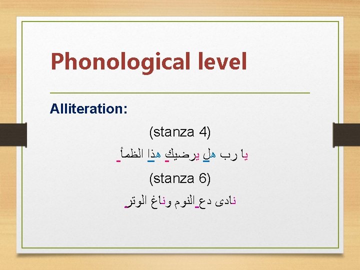 Phonological level Alliteration: ü from the field (stanza 1) ü The phantom of false (stanza 2) ü As the cock crew (stanza 3) ü Soul to solitude (stanza 4)
