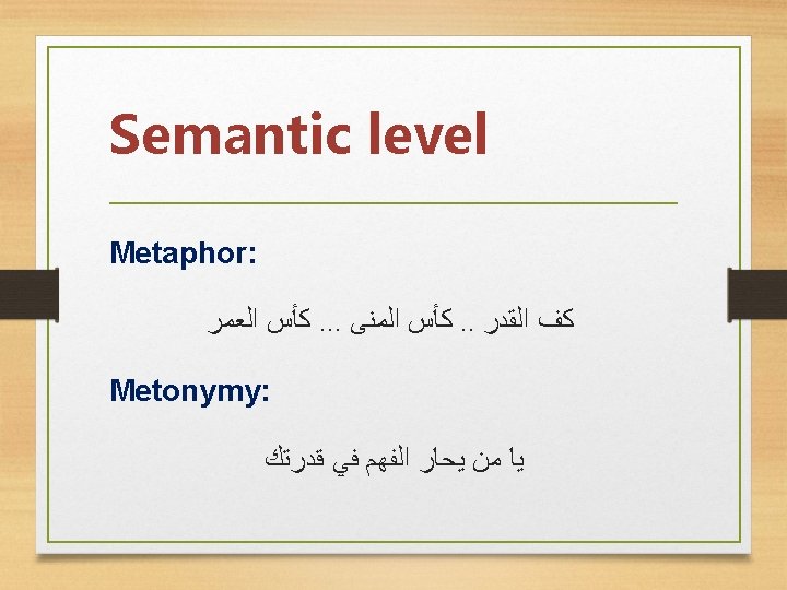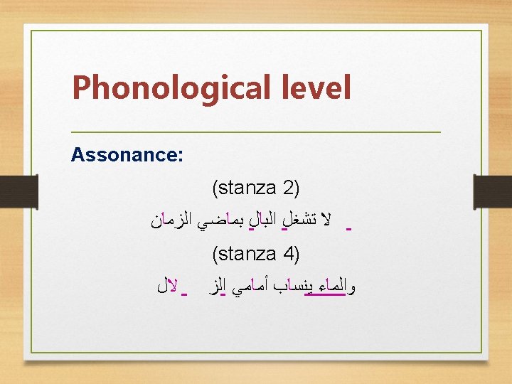 Syntactic level • Repetition of some verbs like ( )ﺍﻏﻨﻢ , (- ﺣﺮﺕ )ﻳﺤﺎﺭ • Repetition of words like ( ﻗﺪ - ﻻ – ﻳﺎ – ﻣﺎ ) • Repetition of imperative form ( – ﺍﻏﻨﻢ – ﻫﺒﻮﺍ )ﻓﺎﻣﺶ