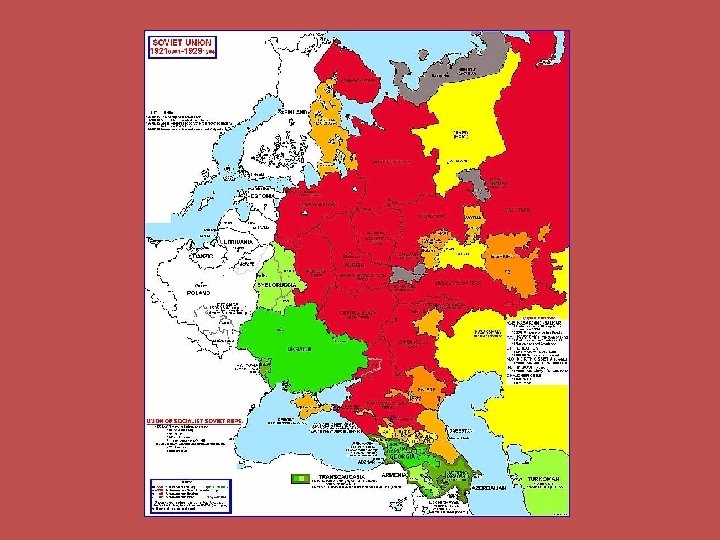 WAR COMMUNISM • December 1917: Armistice with Germany • March 3, 1918 Treaty of Brest Litovsk. Russia loses one fourth of land population (Ukraine, Poland, Finland Baltic states). • Peasants allowed to seize landlord’s lands • Control of factories given to worker’s committees • Church property confiscated • Opposition parties suppressed • Industry nationalized • Secret Police to war on internal enemies: the Cheka
