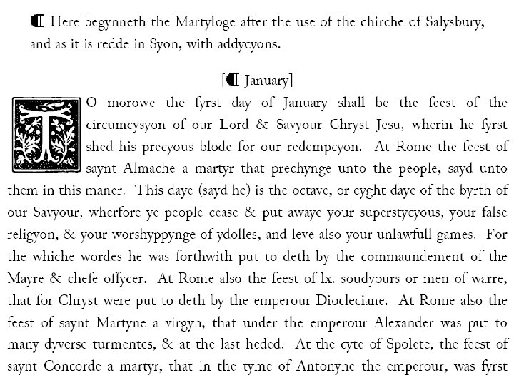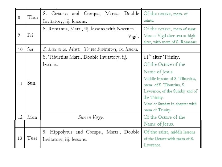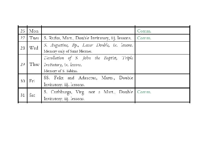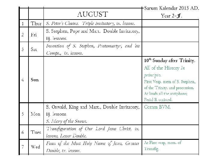 Sarum (selected list) Sulpitious Wulfstan Julian Brigid David Chad Edward, King Cuthbert Richard of Chichester Alphege Erkenwald John of Beverley Dunstan Aldelm Augustine of Canterbury Basil Alban Etheldred Swithun Osmund Kenelm The Holy Name of Jesus Cuthberga Hugh of Lincoln Edith Maurice and his companions Michael on Mount Tumba Frideswide Crispin and Crispinian Wenefrede Edmund of Canterbury Edmund, King Roman Octave of the Conception Paul, the first Hermit Ignatius Anthony John Chrysostom Dorothy Guardian Angels Aquinas Gabriel Joseph Joachim Vincent Isidore Bernard Francis Martha Clare Louis, King Octave of All Saints Various popes