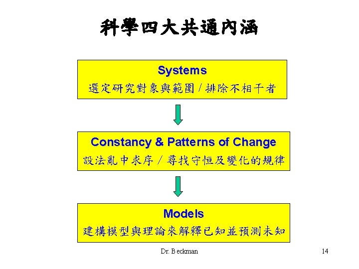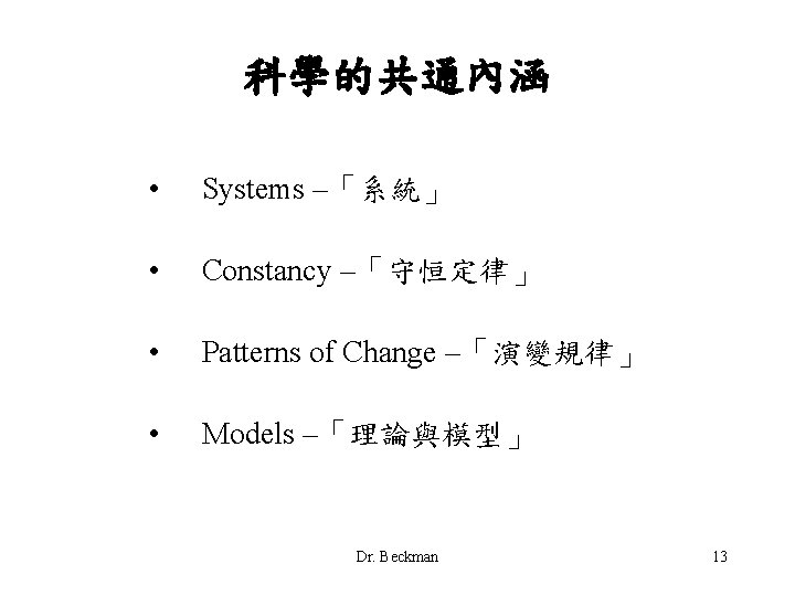 Systems –「系統」 • System – a collection of interrelated things that constitute a unified whole. • A system defines the scope of scientific inquiry and focuses our attention on what is relevant. • 系統 (system) = 由許多相關聯的要素構成的整體。 清楚劃定研究的對象與範圍。 排除不相干的事物,將問題簡化。 • 範例: 鐘錶,太陽系。 Dr. Beckman 15