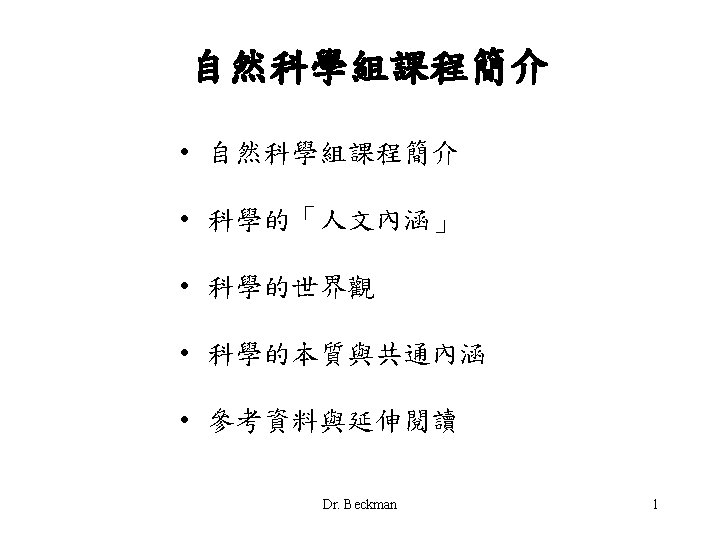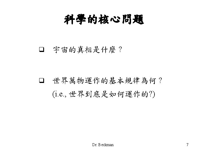 科學的世界觀與基本假設 • 科學的世界觀 (The scientific world view) The world is understandable & the universe is a vast single system in which the basic rules are everywhere the same. • 科學的基本假設 世界的奧秘是人類可以理解的,而非人類無法瞭解的 宇宙各處所有的事物皆遵循同一套規則運作 Dr. Beckman 6