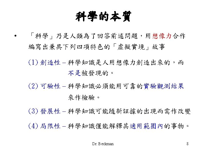 科學的「創造性」本質 • 科學知識是人用想像力創造出來的,而不是被發現的。 • Science is a blend of logic and imagination. • Inventing hypotheses or theories to imagine how the world works and figuring out how they can be put to the test of reality is as creative as writing poetry or composing music. • 範例 : 牛頓用想像力與邏輯推理「創造」出萬有引力定律。 Dr. Beckman 9