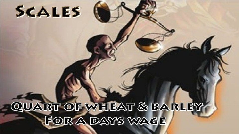 REVELATION 6: 5 -6 When the Lamb opened the third seal, I heard the third living creature say, “Come!” I looked, and there before me was a black horse! Its rider was holding a pair of scales in his hand. Then I heard what sounded like a voice among the four living creatures, saying, “Two pounds of wheat for a day’s wages, and six pounds of barley for a day’s wages, and do not damage the oil and the wine!”