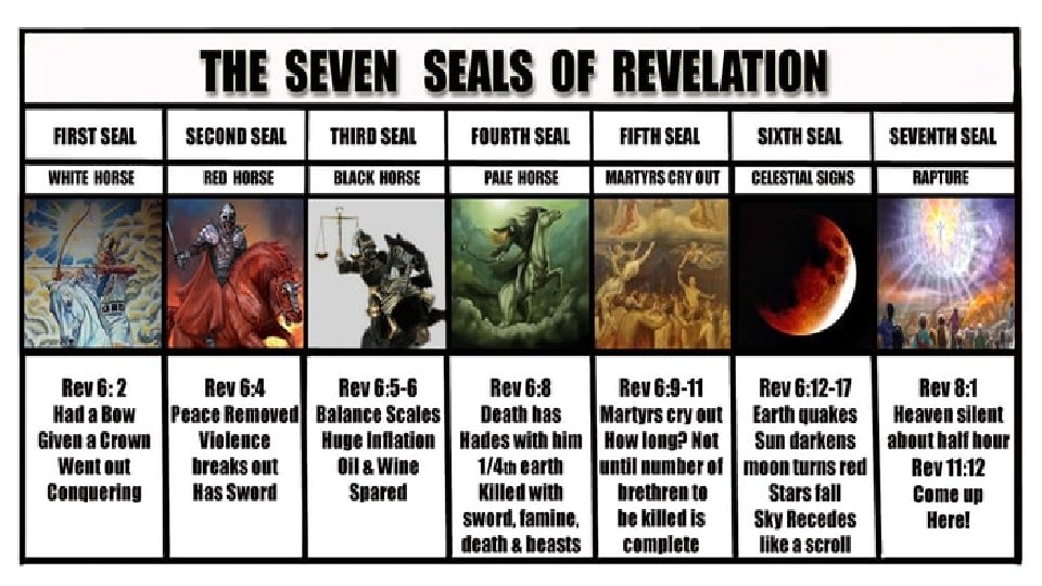 REVELATION 6: 1 -2 I watched as the Lamb opened the first of the seven seals. Then I heard one of the four living creatures say in a voice like thunder, “Come!” I looked, and there before me was a white horse! Its rider held a bow, and he was given a crown, and he rode out as a conqueror bent on conquest.