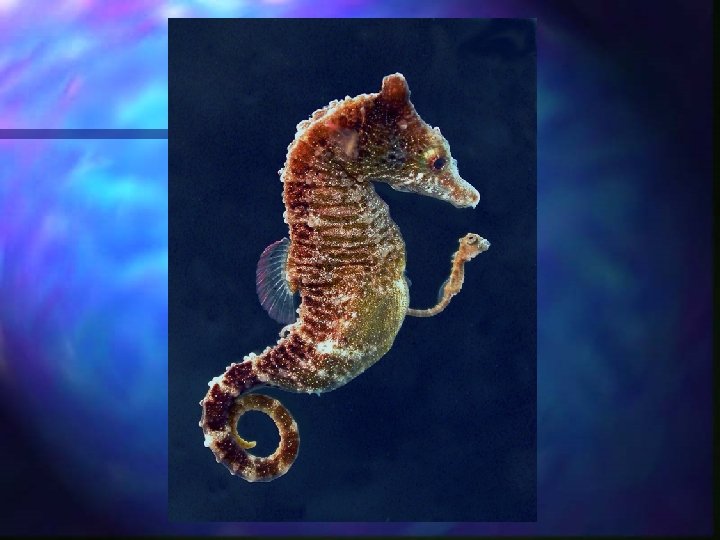 What’s so unusual ? n n n External brooding in a paternal pouch distinguishes seahorses and pipefishes. Females oviposit into the male pouch, where the eggs are fertilized and incubated to term. The pouch functions in 1) ion regulation, 2) gas exchange, and 3) materials transfer. Embryos hatch precociously, yet remain enveloped in male pouch tissue for further development. Surfaces develop on the brood pouch and on the embryo to facilitate paternal-embryonic uptake.