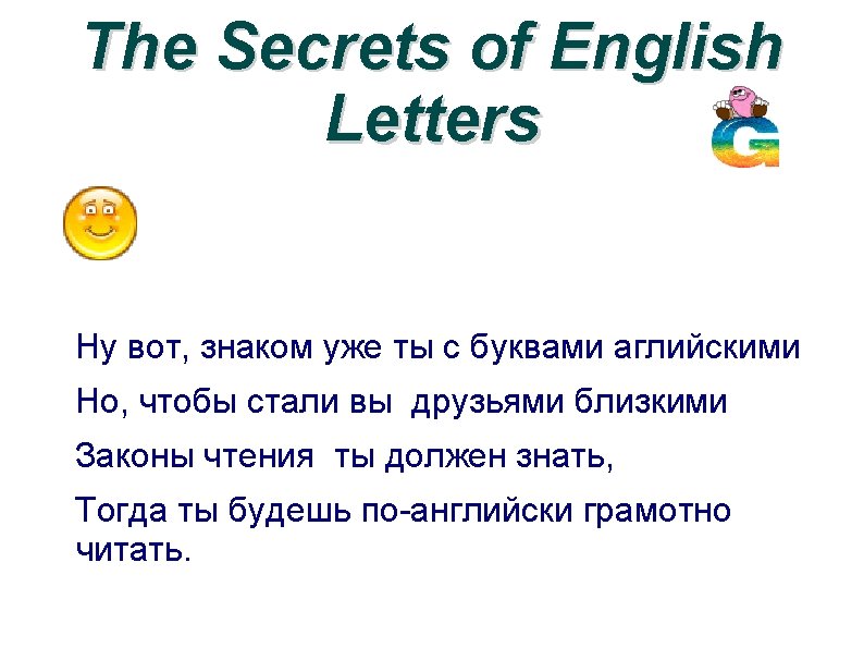 The Secrets of English Letters PART I e Slides: 13 Download presentation The Secrets of English Letters PART I [e. I] 1. Find the transcription of the following words. 2. Transcribe the following words & read them. Take Late Same Plane Brave Gave [te. Ik] [le. It] [se. Im] [ple. In] [bre. Iv] [ge. Iv] 2. Transcribe the following words & read them. Fail Sail Mail Wait Play May Say [fe. Il] [se. Il] [me. Il] [we. It] [ple. I] [me. I] [se. I] 3. Try to write words according to their transcriptions. [sne. Ik] [ne. Im] [te. Il] [le. It] [ge. Im] Snake Name Tale Late Game 3. Try to write words according to their transcriptions. [gre. Id] [we. Iv] [re. Iz] [ple. It] [me. It] grade wave raze plate mate http: //www. gifmania. pk/Animated-Gifs-Animated. Letters/ http: //sig. graphicsfactory. com/ Каркусова Д. М. «Секреты английских букв» Изд. «Феникс» 2009