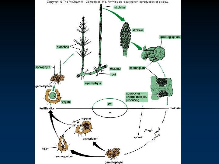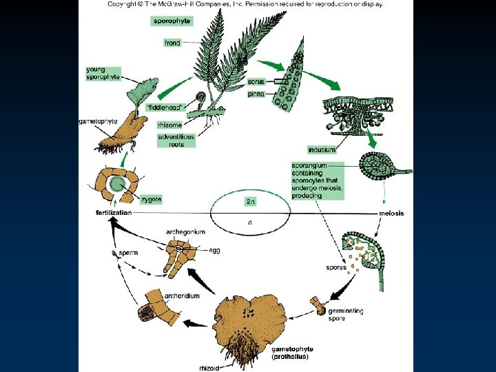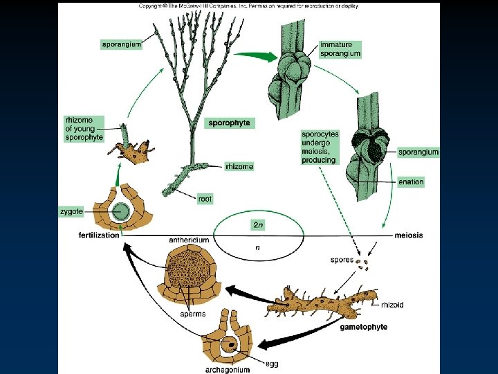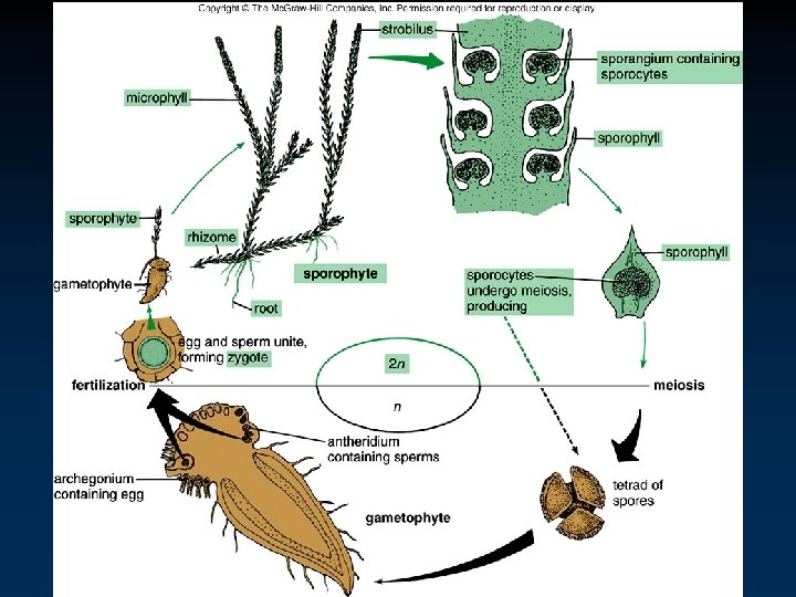 Phylum Lycophyta • • Lycopodium - Ground Pines v Often grow on forest floors. v Resemble little Christmas trees, complete with cones. v Stems are simple or branched. - Develop from branching rhizomes. Reproduction