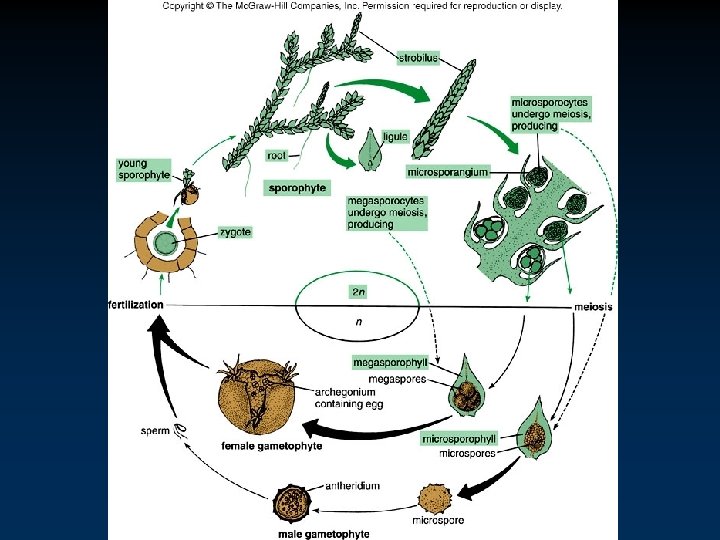 Phylum Lycophyta • • Selaginella - Spike Mosses v Especially abundant in tropics. v Branch more freely than ground pines. v Leaves have a ligule on upper surface. v Produce two different kinds of spores and gametophytes (heterospory). Reproduction