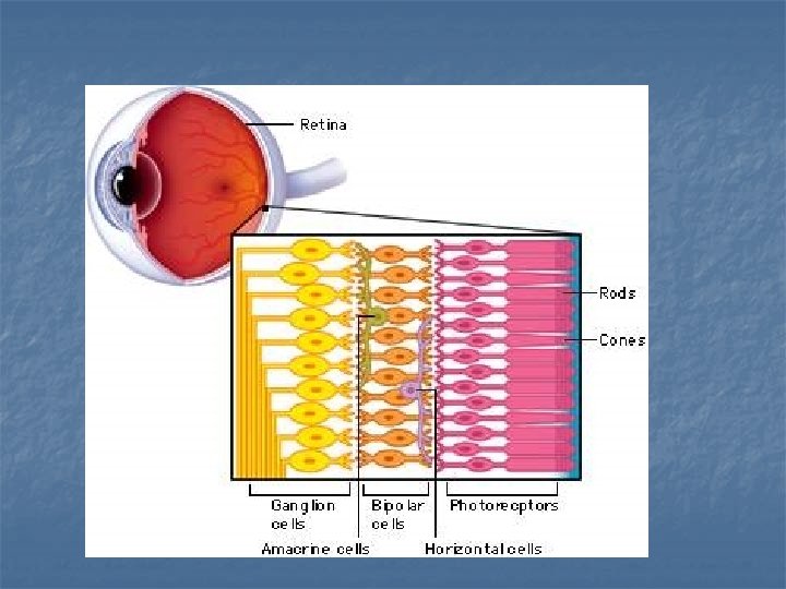 Internal Layer: Retina (3) n two types of photoreceptor cells, rods and cones n two layers of cells (bipolar cells and ganglionic cells) that organize visual information before impulses are sent to the brain
