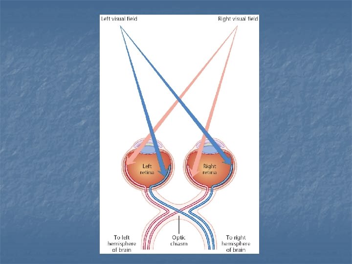 n a focused image is inverted (upside down) n The brain ‘rights’ the image n To do this neurons join at the optic chiasma and then split to the right and left visual cortex n this allows for stereoscopic vision and depth perception.