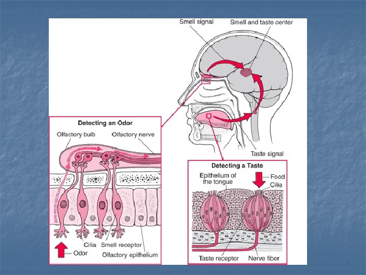 The Nose (The nose knows. Phew!) n n 3000 times more receptors for smell than for taste. (VERY SENSITIVE, LOTS OF IMPULSES) receptors are located on tissue called the olfactory epithelium. The neurons have modified cilia on the ends of their dendrites that trap and receive airborne (gas or vapor) molecules. http: //www. bbc. co. uk/science/humanbody/b ody/factfiles/smell_ani_f 5. swf