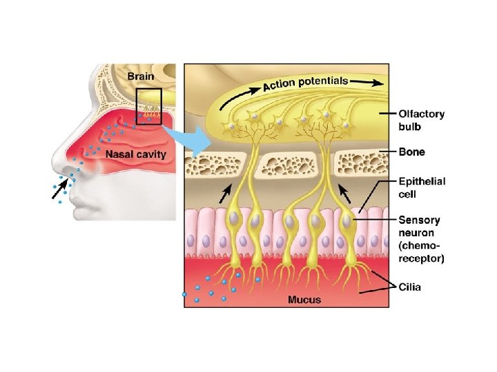 Smell & Taste Olfactory (smell) bulb Taste sensory area Olfactory nerve Thalamus Cerebral cortex Smell receptor Nasal cavity Smell sensory area Taste bud Taste pore Taste receptor Sensory nerve fibers