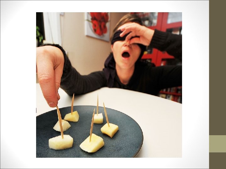 Aging • After age 50, ability to smell and taste decrease • Membranes lining nose become thinner & drier olfactory nerve deteriorate • # taste buds decrease with age more difficult to detect sweet/salty foods taste more bitter • As people age, their food tastes more bland eat less possible malnutrition