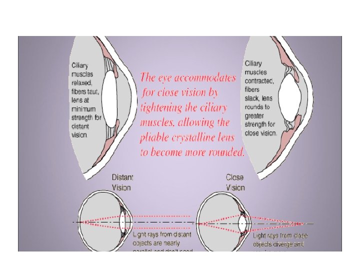 Lens accommodation cont’ • Light refracts when it hits the lens. • We have a biconvex lens that allows light to converge to one point.