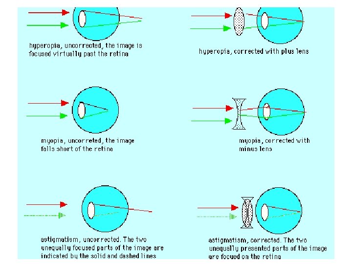 Eye probs cont… • Hypermetropia = far-sightedness • Sees distant objects very well but not objects close up • Because of a shortened eyeball or a insufficiently curved lens • The image is focused behind the retina. • Corrected with a biconvex lens.