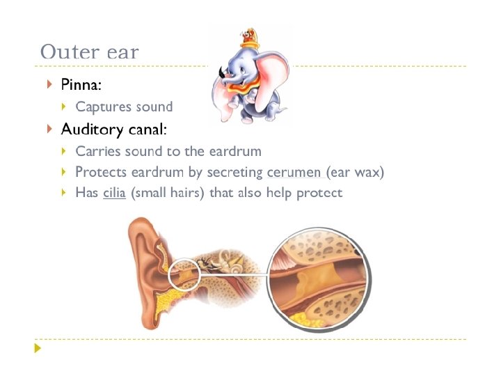 Outer Ear • Pinna (auricle): only visible part of the ear. It is shaped like a funnel to pick up sound vibrations easily from air • Auditory canal: slightly curved, about 2. 5 cm long canal that carries sound vibrations to the eardrum. It is lined with fine HAIR and sebaceous glands (produce wax)= prevent foreign bodies from entering the ear