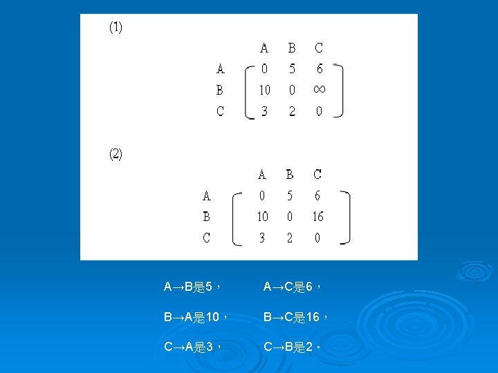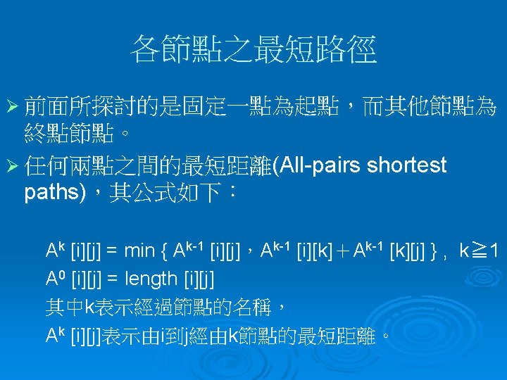 =>演算程式碼 int dist [N][N] ; floyd ( ) { int i , j , k ; for ( i = 0 ; i < N; i ++) for (j = 0 ; j < N ; j ++) for (k = 0 ; k < N ; k ++) if ( dist [i] [j] > dist [I ][k] + dis [k][j]; }