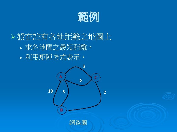 =>演算虛擬碼 Procedure FLOYD(W) N ←rows[W] D(0) ←W for k← 1 to n do for i ← 1 to n do for j← 1 to n do end for return D(n) end FLOYD