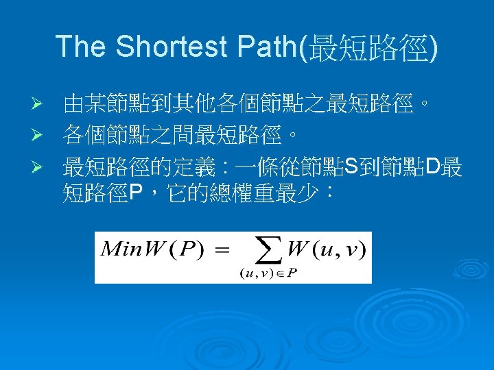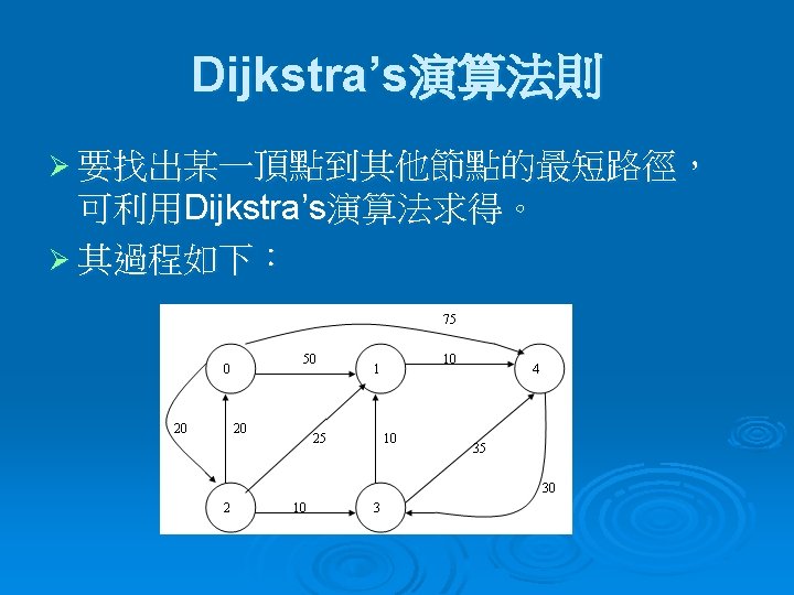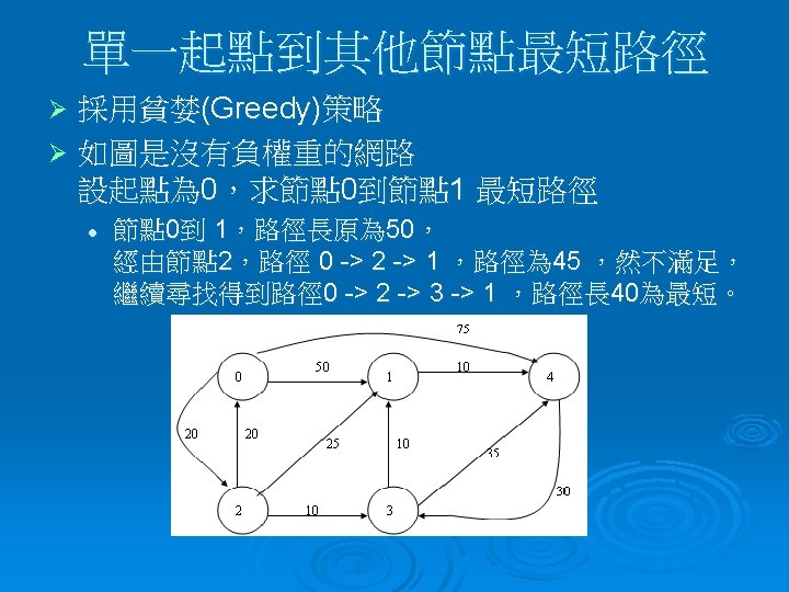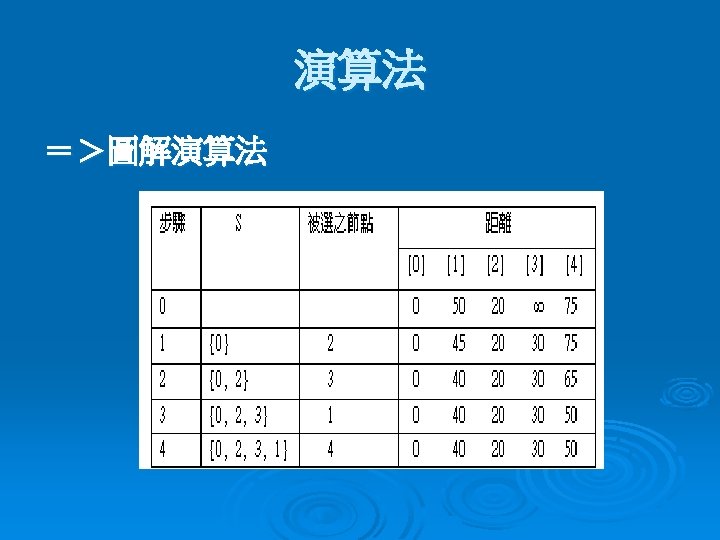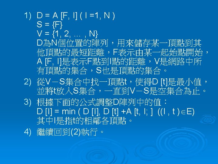 =>演算虛擬碼 若Procedure SHORTEST_PATH (v, COST, DIST, n) Declare S (1 : n ) for j ← 1 to n S( j )← 0 ; DIST( j )←COST( v , j ) End S( v )← 1 ; DIST( v )← 0 ; num← 2 While num < n do Choose u : DIST(u) = min{DIST(w)} S(u)← 1 ; num←num+1 For all w with S(w) = 0 do DIST(w) ←min {DIST(w), DIST(u) + COST(u , w ) } end end SHORTEST_PATH