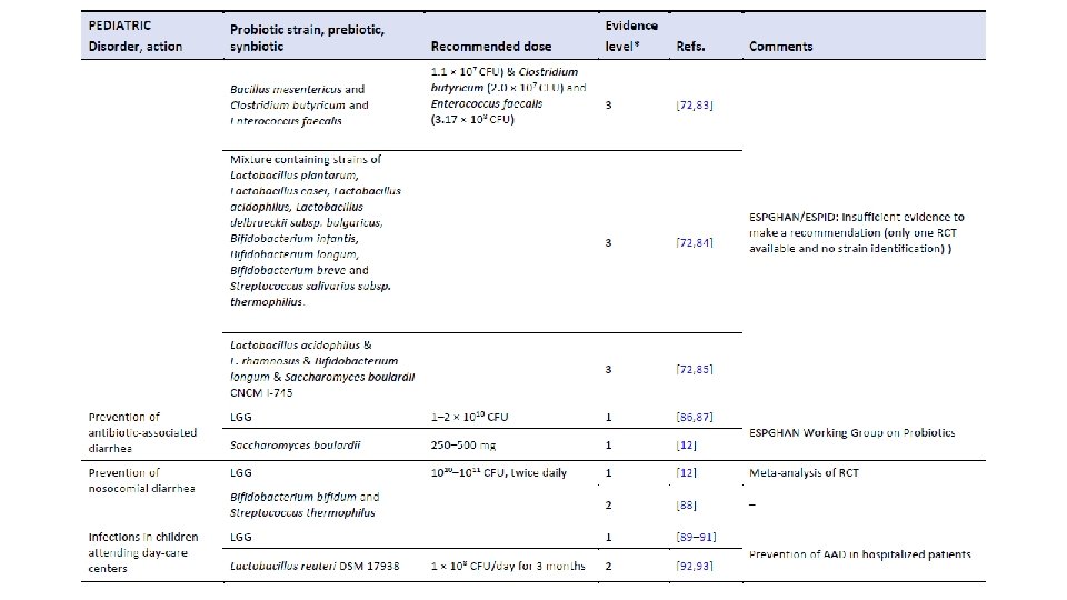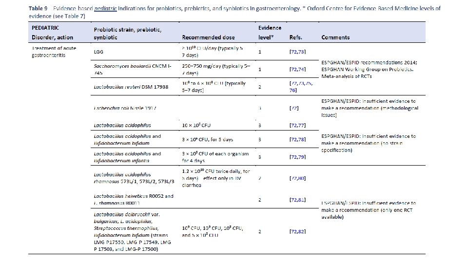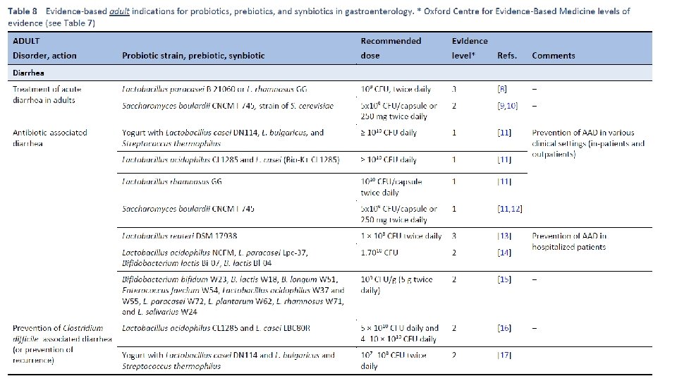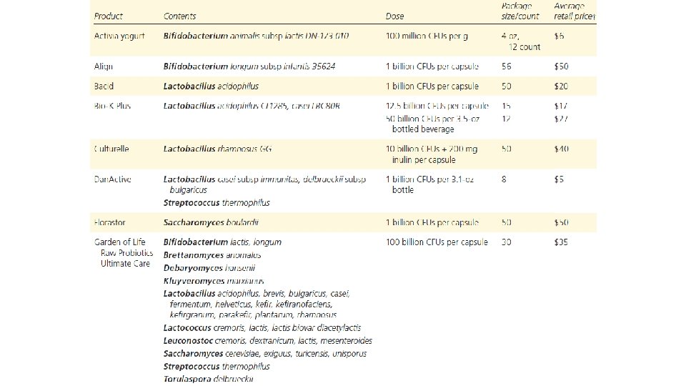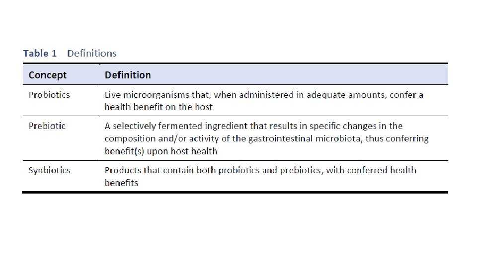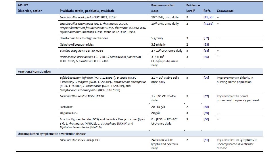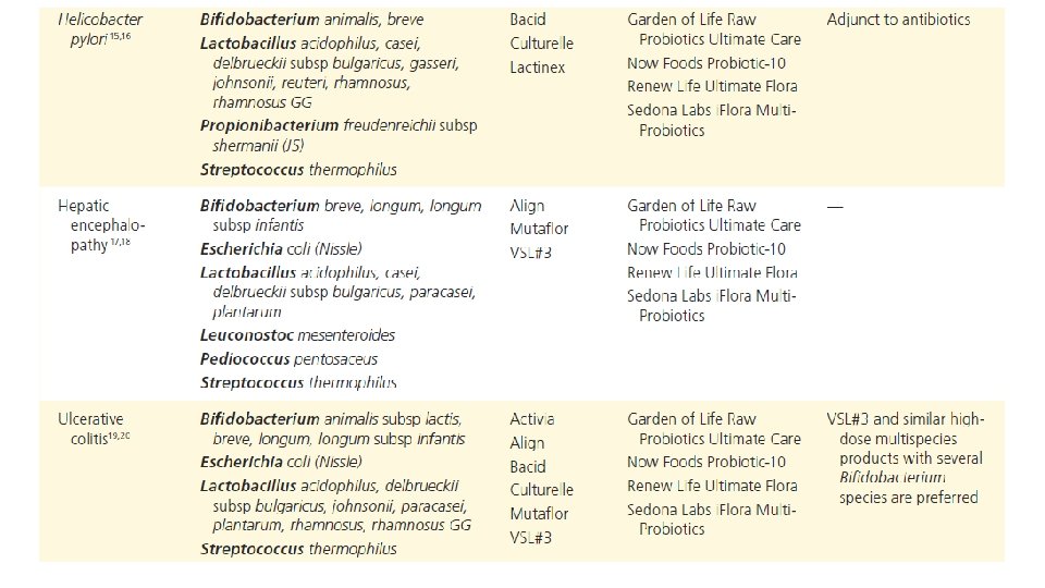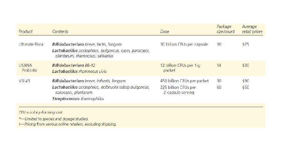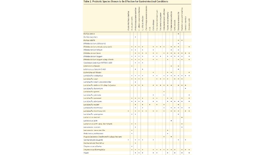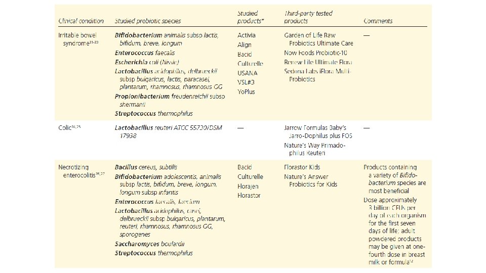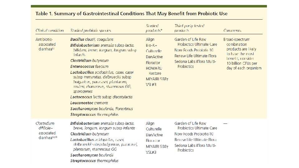 Proposed Mechanisms of Probiotics • Block the adhesion of pathogenic bacteria to the intestinal epithelium; produce inhibitory agents • Enhance the intestinal immune response • Maintain normal levels of short-chain fatty acids • Modulate immune system function, such as suppression of intestinal proinflammatory cytokines • Repair intestinal permeability • Suppress the growth of pathogenic bacteria by directly binding to gram-negative bacteria • Upregulate intestinal electrolyte absorption Probiotics for Gastrointestinal Conditions: A Summary of the Evidence. Thad Wilkins, Jacqueline Sequoia. Am Fam Physician. 2017 Aug 1; 96(3): 170– 178.