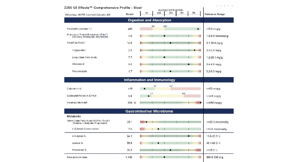 Dysbiosis • Stress has been shown to influence the integrity of the gut epithelium and to alter peristalsis, secretions, and mucin production • IBS patients have shown a 2 -fold increase in the ratio of Firmicutes to Bacteroidetes • IBD patients have shown greatly reduced diversity of Firmicutes (producers of anti-inflammatory SCFA) • Diverting ileostomy resolves IBD. • Differences in microbiota between obese and lean people. • Decreased diversity of Bacteroidetes at 12 months of age in atopic-eczema patients. Bull MJ, Plummer NT. Part 1: The Human Gut Microbiome in Health and Disease. Integr Med (Encinitas). 2014; 13(6): 17– 22.