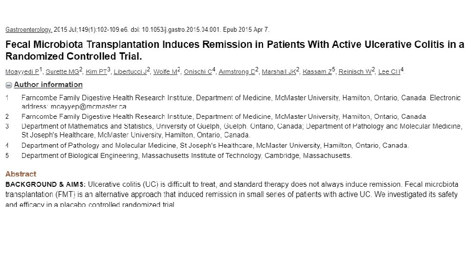 Members of the Steering Committee for the AGA FMT Registry, Kelly CR, Kahn S, et al. Update on FMT 2015: Indications, Methodologies, Mechanisms and Outlook. Gastroenterology. 2015; 149(1): 223 -237. doi: 10. 1053/j. gastro. 2015. 008.