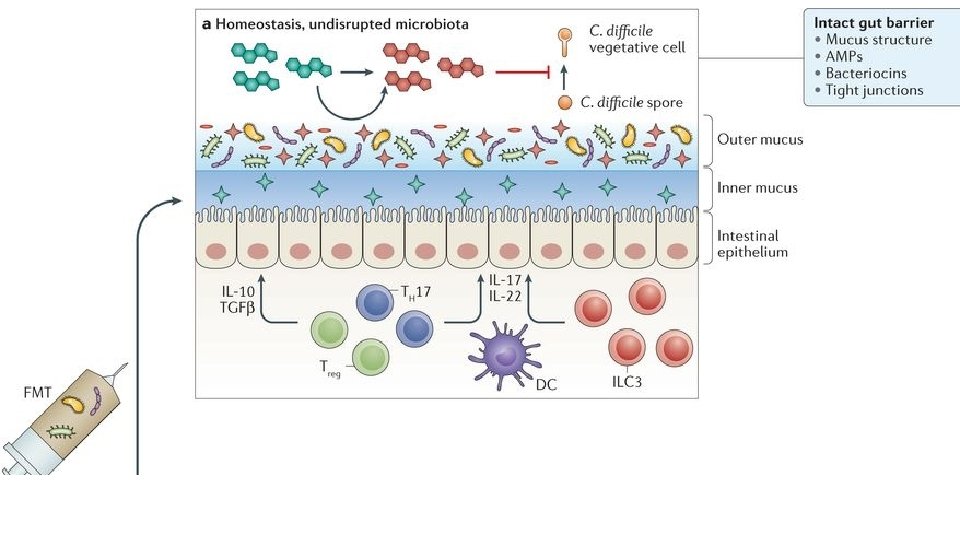 FMT for C. diff infection • Fecal microbiota transplantation (FMT) involves administration of the whole microbial community from healthy donor stool into the recipient's intestinal tract to normalize or modify intestinal microbiota composition and function • Overall suppression of microbiota and disruption of its community structure in the colon, most commonly resulting from antibiotic therapies, is the fundamental problem underlying the pathogenesis of Clostridium difficile infection (CDI) • FMT results in normalization of microbial diversity and community structure in patients being treated for CDI, with high rates of clinical cure • The restored colon microbial community could inhibit C. difficile by multiple mechanisms: competition for nutrients; direct suppression by antimicrobial peptides; bile-acid-mediated inhibition of spore germination and vegetative growth; and activation of immune-mediated colonization resistance Understanding the mechanisms of faecal microbiota transplantation. Khoruts A. & Sadowsky M. Nature Reviews Gastroenterology & Hepatology Volume 13, pages 508– 516 (2016)