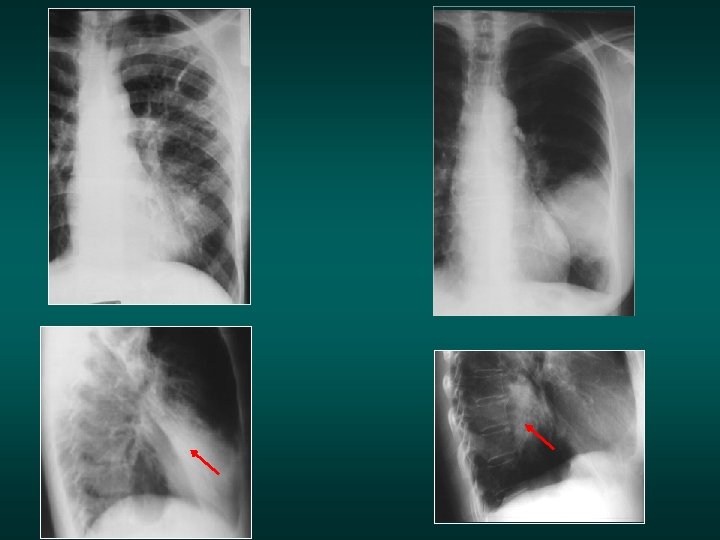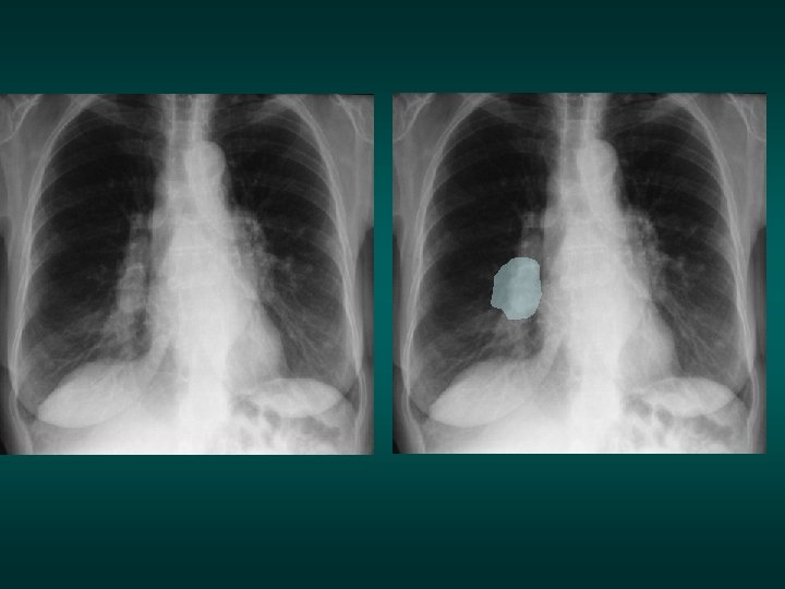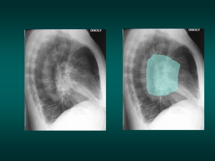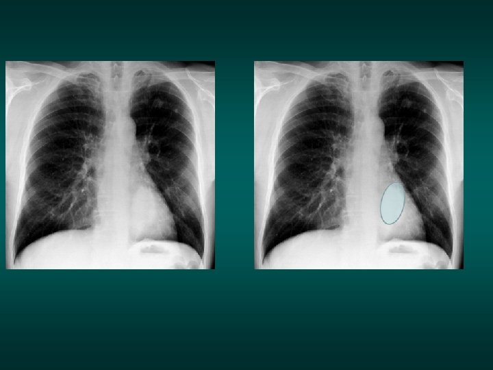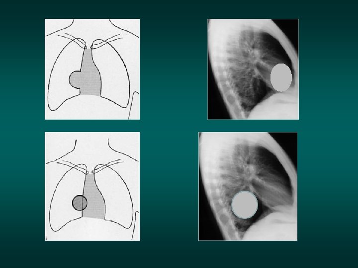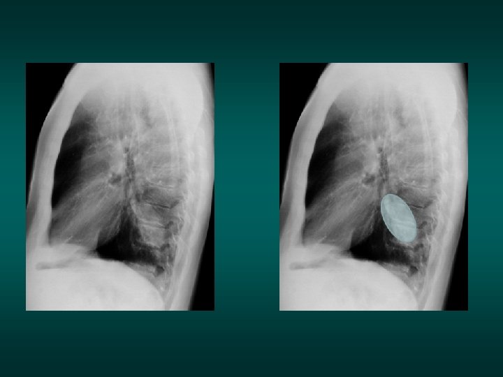 The silhouette sign • When 2 opacities of the same density are in contact with each other, their contours disappear. • When they are separated by any tissue of a different density (air), their respective contours are visible.