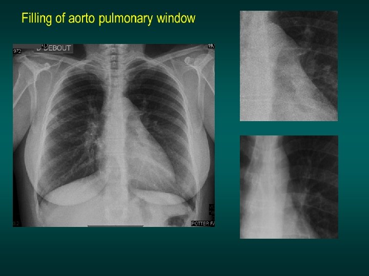 Application of the sihouette sign: Filling of the aorto-pulmonary space aorta Pulmonary artery Adenopathy in aorto-pulmonary space