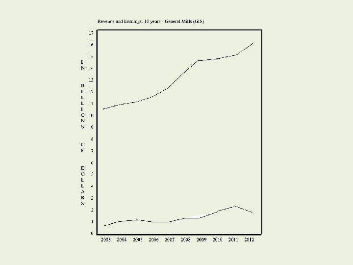General Mills 2003 2004 2005 2006 2007 2008 2009 2010 2011 2012 (In millions). Revenue Earnings $10, 506 $ 917 11, 070 1, 055 11, 244 1, 240 11, 640 1, 090 12, 442 1, 144 13, 652 1, 295 14, 691 1, 304 14, 797 1, 531 14, 880 1, 804 16, 658 1, 567