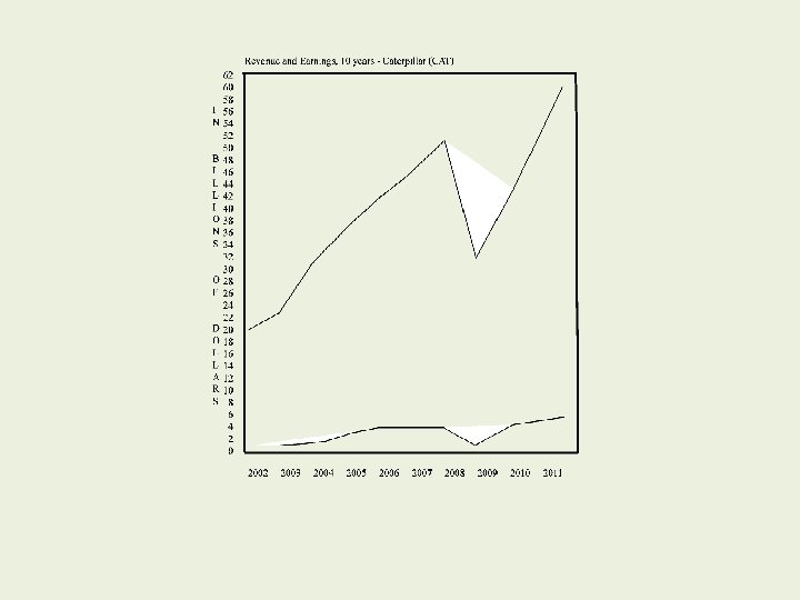 Caterpillar 2002 2003 2004 2005 2006 2007 2008 2009 2010 2011 (In millions). Revenue Earnings $20, 152 $ 798 22, 763 1, 099 30, 251 2, 035 36, 339 2, 854 41, 517 3, 537 44, 958 3, 541 51, 324 3, 557 32, 396 895 42, 588 2, 700 60, 138 4, 928