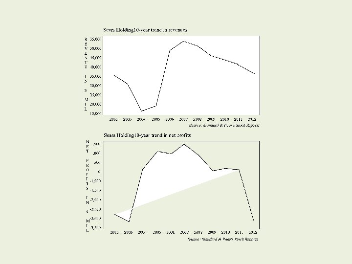 Sears Holding 2003 2004 2005 2006 2007 2008 2009 2010 2011 2012 (In millions). Revenue Earnings $30, 762 $-3, 262 17, 072 248 19, 701 1, 106 49, 124 948 53, 012 1, 490 50, 703 826 46, 770 53 44, 043 235 43, 326 150 41, 567 -3, 113