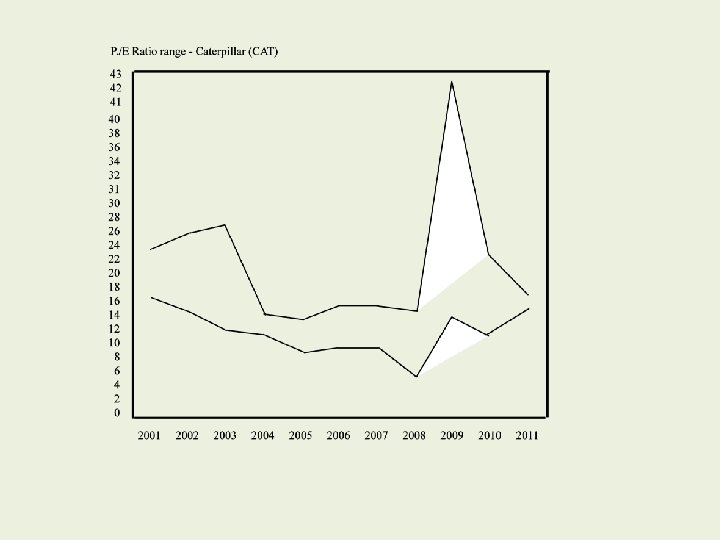 P/E rules of thumb Generally, a P/E between 10 and 25 is a positive signal. However, the trend is as important as where P/E is today. Irregular and volatile P/E is a sign of volatility in the stock and in the fundamentals. For example, Caterpillar has reported very erratic P/E range over recent years.