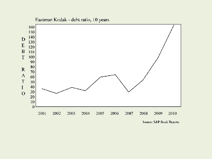 The meaning of debt ratio For example, Eastman Kodak was for many years considered one of the strongest and best capitalized blue chip companies in the market. However, EK did not keep up with changing markets and when the digital camera boom arrived, they lost market share. In 2007, EK’s debt ratio was about 30 – but by the end of 2010, it was above 160. When debt ratio is over 100, it means debt has entirely absorbed equity. The company’s stock is worthless.