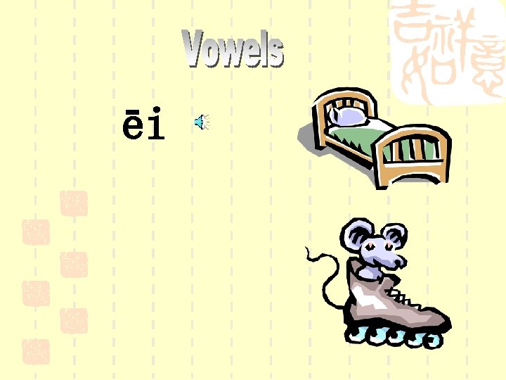 The six vowels in Pinyin pronunciation are listed in the following slide show. They will be read in the first tone, which sounds like a sustained sung note. Please listen and repeat after me.