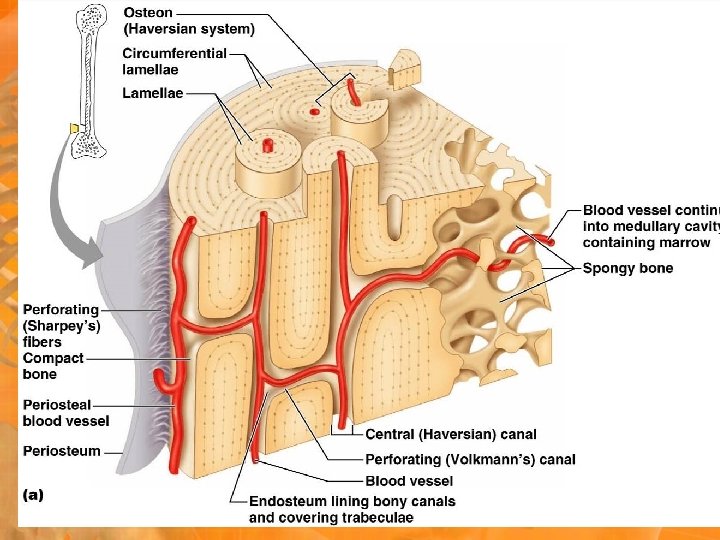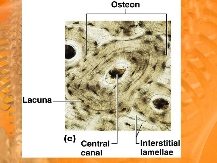Compact Bone Osteons • Blood vessels run through perforating (Volkman’s) canals to the central (Haversian) canals • Osteon - central canal with lamellae, lacunae, osteocytes, & canaliculi • osteocytes in lacunae • canaliculi – house multiple cytoplasmic extensions from the osteocytes