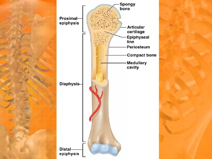 Spongy Bone • No true osteon systems – osteoblasts produce an irregular strut work of trabeculae • Osteocytes receive nutrients by diffusion through canaliculi • Red marrow (1) fills the spaces between the trabeculae (2) (hematopoietic marrow) • Blood vessels pass through compact bone to spongy bone • Blood vessels pass through yellow marrow cavities; open out to become red marrow cavities
